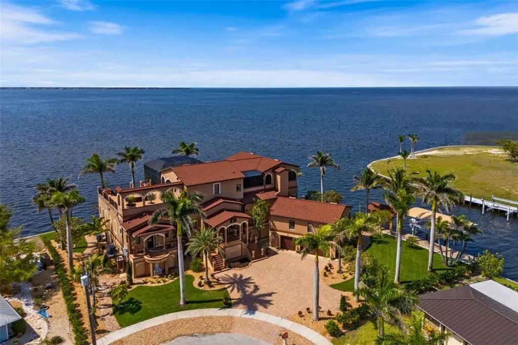 Set on a rare tip lot with approximately 320 feet of pristine waterfront, this one-of-a-kind custom estate delivers an extraordinary blend of architectural elegance, thoughtful engineering, and effortless coastal living. Designed and built as a private retreat, the home spans over 5,500+ sq. ft. of air-conditioned space and more than 7,000+ sq. ft. of seamlessly integrated outdoor living areas, all oriented to showcase uninterrupted views of Charlotte Harbor. Constructed atop 93 deep-set concrete pilings and elevated 15 feet above the waterline, the residence features concrete floors, impact-rated windows, hurricane shutters, and a standby generator with remote monitoring for peace of mind and durability. Inside, custom stonework, intricate imported carvings, and refined finishes lend timeless character to every space. The home offers six spacious bedrooms, each with en-suite baths and private balcony or veranda access, comfortably accommodating up to fifteen guests. The primary suite includes dual walk-in closets, dual commode rooms, a spa tub, oversized shower, and a private lanai with gas fireplace and serene harbor views. A chef’s kitchen anchors the home, featuring commercial-grade appliances, three dishwashers, a wine cooler, and a large island ideal for entertaining. A walk-in butler’s pantry with extensive storage and a coffee or tea bar adds both function and style. Additional interior highlights include art niches, three gas fireplaces, custom cabinetry, and luxury finishes throughout. Outdoor living is elevated by a dramatic two-story screened lanai that doubles the home’s footprint. The main-level infinity-edge pool and spa appear to cascade into the harbor, while the adjacent outdoor kitchen includes a commercial grill, granite countertops, marine-grade cabinetry, a bar with dual-tap kegerator, and a refrigerator—perfect for gatherings of any size. Multiple seating areas, both screened and open-air, provide ideal vantage points for sunrise, sunset, and every moment in between. Boaters will appreciate the new 65-foot dock equipped with shore power, water, lighting, cameras, and a 16,000 lb lift. With direct access to open water and no bridges, it’s a short cruise to Cayo Costa’s beaches or nearby waterfront destinations such as Sarasota, Fort Myers Beach, and Key West. Smart-home features include app-controlled HVAC, indoor and landscape lighting, ceiling fans, garage doors, video surveillance, and pool systems. The irrigation system, fed by a private well, operates remotely with a dedicated sprinkler for every outdoor plant. Connectivity is supported by a Luxul Wi-Fi network with 13 access points, HyperFiber high-speed internet, and Xfinity backup. Additional features include an elevator serving all three levels, dual laundry rooms, a three-car garage with EV charging, professionally landscaped grounds with tropical plantings, fruit-bearing trees, and extensive paver work. Distinct spaces such as a media suite, octagonal view room, study, and formal dining room complete the interior. Located in a peaceful community just 15 minutes from Punta Gorda Airport and within easy reach of Tampa, Naples, and Sarasota, this waterfront residence combines comfort, sophistication, and extraordinary views!!
